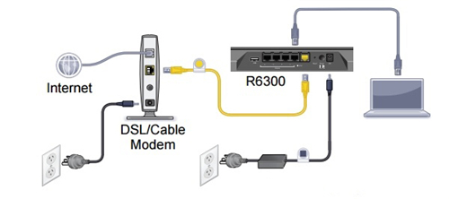 1、电话线上网:用户需要准备2根网线,一根网线用来连接ADSL Modem(宽带猫)与NETGEAR R6300路由器的WAN接口;另一根网线用来连接计算机与R6300路由器的LAN接口(1/2/3/4中的任意一个都可以)。
