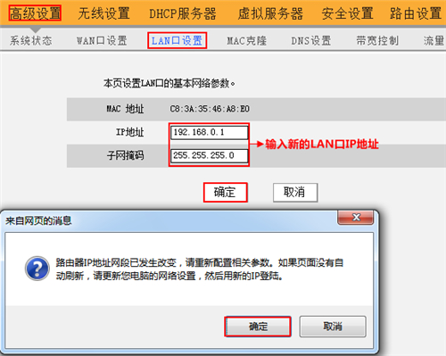 3)在随后的页面中依次点击“高级设置”-“LAN口地址” 输入新的LAN口192.168.0.1 点击“确定”在弹出的对话框中再次点击“确定”即可。(重启后请使用新的LAN口地址登录)