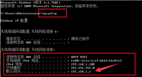 进去命令提示符之后,我们输入ipconfig,按回车键,进行查看电脑的ip地址,如下图所示: